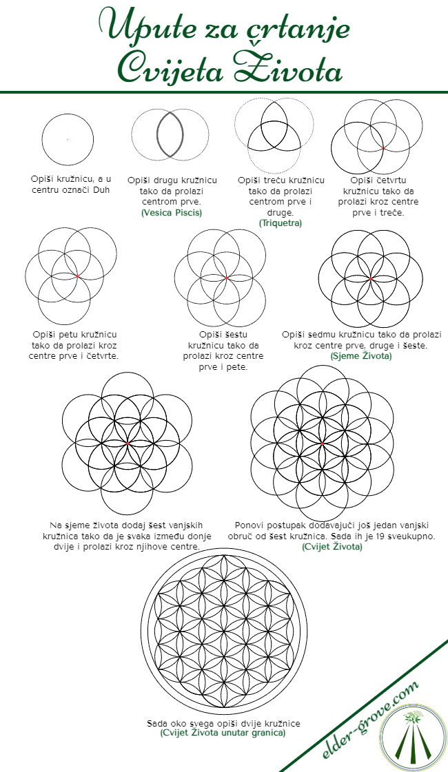 (U nastojanju da vam što bolje približimo svetu geometriju i njenu važnost u širenju duhovne svijesti, pokušat ćemo se u ovom tekstu držati što je moguće više teme Cvijeta Života dok ćemo ostale pojmove iz svete geometrije zasebno obraditi. Pratite objave na našem blogu u budućnosti jer čekaju vas mnoge poslastice poput Platonovih tijela i njihove veza s Elementima, povezanost zlatnog reza i Fibonaccijevog niza te brojne druge zanimljive teme iz svete geometrije i njihov utjecaj na duhovnost.)